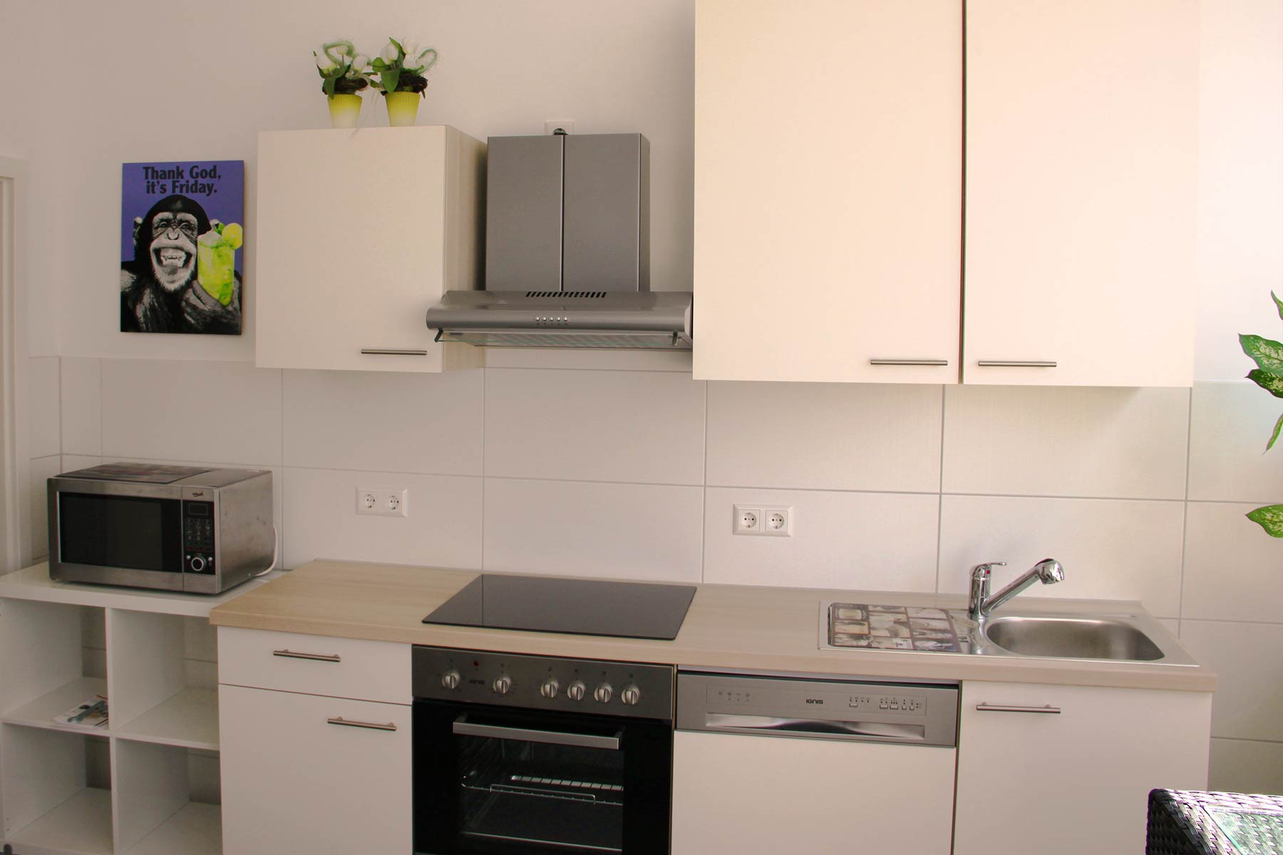 In unserer offenen Küche finden Sie alles was Sie brauchen, Kaffeemaschine, Wasserkocher, Geschirr, Töpfe, eine Kühl-Gefrierkombination für Ihre Lebensmittel,
